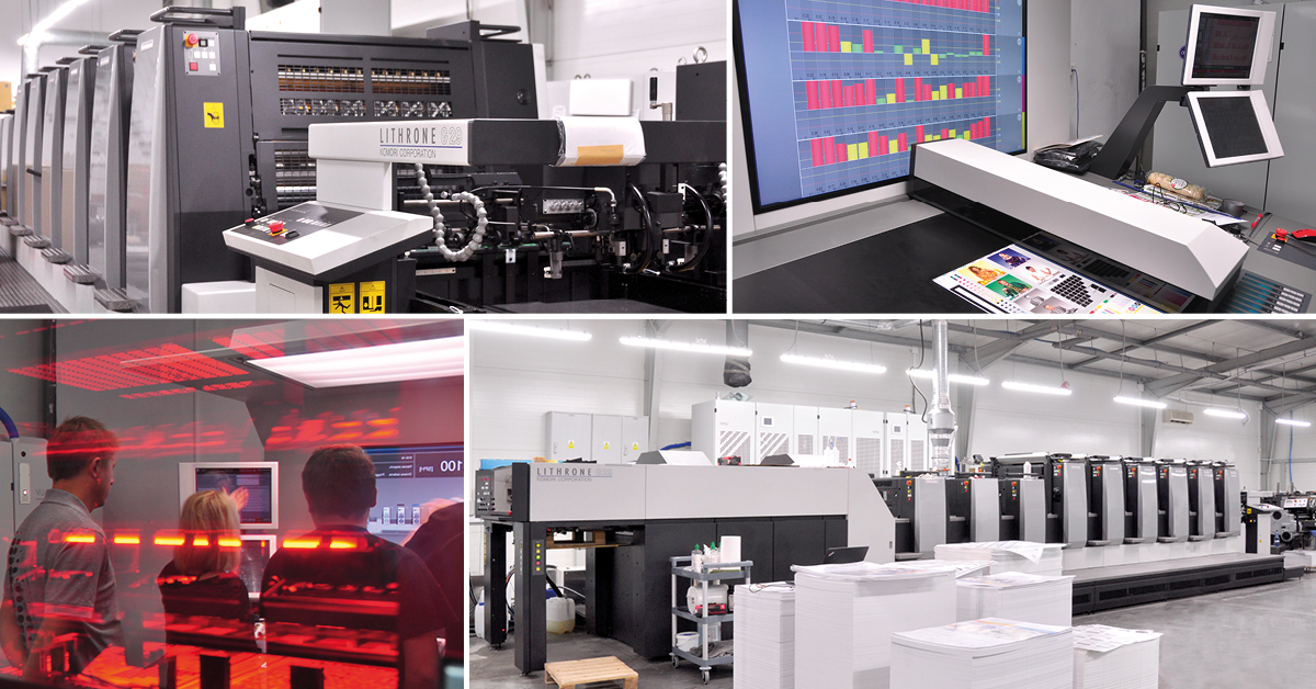 - Komori Lithrone GL-629: druk 6-cio kolorowy z dwiema wieżami lakierującymi UV lub dyspersja oraz zespołem suszącym, maszyna wyposażona w systemy automatycznie korygujące nafarbianie, przyrost punktu oraz kamery inspekcyjne